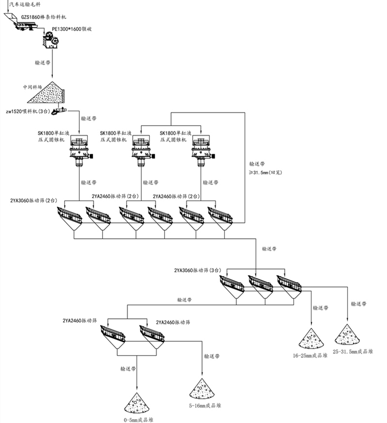 作為生產(chǎn)線來(lái)說(shuō),產(chǎn)能不同,破碎的物料不同,所需要的設(shè)備配置也不同。本文以雙金機(jī)械時(shí)產(chǎn)1000噸的客戶產(chǎn)線為例,進(jìn)行簡(jiǎn)單介紹。首先該客戶產(chǎn)量是時(shí)產(chǎn)1000噸,破碎石灰石,要求出料規(guī)格是0-5mm,5-10mm,10-20mm,20-31.5mm,雙金機(jī)械為其配置的主設(shè)備包括GZS1860棒條給料機(jī)1臺(tái),ZW1520振動(dòng)給料機(jī)2臺(tái),SJ.E.13.16顎破1臺(tái),SK.56.14單缸液壓圓錐機(jī)1臺(tái)+SK.Y.1800單缸液壓圓錐機(jī)2臺(tái)+3YKQ3072振動(dòng)篩6臺(tái)。除了以上主要設(shè)備外,生產(chǎn)線還應(yīng)配置輸送機(jī)等輔助設(shè)備。以下是關(guān)于時(shí)產(chǎn)1000噸的工藝流程圖(具體還應(yīng)根據(jù)需求來(lái)定制,針對(duì)石料規(guī)格、產(chǎn)量、石料用途的要求,提供合理、經(jīng)濟(jì)的設(shè)備配置流程)。
