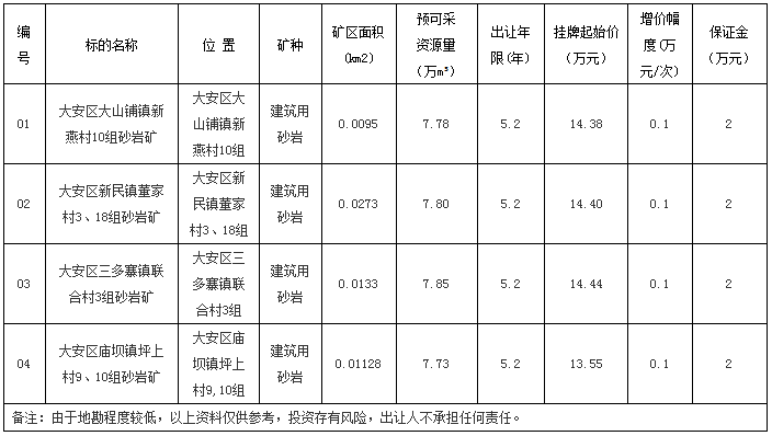 根據《中華人民共和國礦產資源法》、國土資源部《探礦權采礦權招標拍賣掛牌管理辦法(試行)》、《四川省采礦權招標拍賣掛牌出讓暫行辦法》及有關法律、法規的規定,經自貢市大安區人民政府同意,受自貢市大安區國土資源局委托,自貢市公共資源交易服務中心組織實施大安區大山鋪鎮新燕村10組等4處砂巖礦采礦權公開掛牌出讓工作。現將出讓相關事項公告如下: