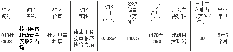 根據(jù)《中華人民共和國礦產(chǎn)資源法》、國土資源部關(guān)于印發(fā)《礦業(yè)權(quán)交易規(guī)則》(國土資規(guī)〔2017〕7號)的通知和《國土資源部關(guān)于完善礦產(chǎn)資源開采審批登記管理有關(guān)事項的通知》(國土資規(guī)〔2017〕16號)和《湖南省人民政府辦公廳關(guān)于印發(fā)〈湖南省礦業(yè)權(quán)招標(biāo)拍賣掛牌出讓管理辦法〉的通知》(湘政辦發(fā)〔2016〕65號)等有關(guān)規(guī)定,經(jīng)桂陽縣人民政府批準(zhǔn)同意,我局決定在湖南省國土資源網(wǎng)上交易系統(tǒng)(以下簡稱“網(wǎng)掛系統(tǒng)”)(http://www.hngtjy.com)以掛牌方式出讓以下礦區(qū)采礦權(quán),并委托桂陽縣國土資源產(chǎn)權(quán)交易中心承辦具體事宜。現(xiàn)將有關(guān)事項公告如下:
