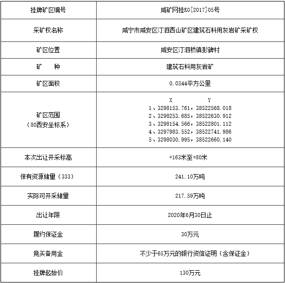根據《中華人民共和國礦產資源法》、《探礦權采礦權招標拍賣掛牌管理辦法》和《咸寧市采礦權網上掛牌出讓規則》等法律和規定,經咸安區人民政府批準,咸安區國土資源局定于2017年11月15日至2017年12月21日,在湖北省咸寧市國土資源網上交易系統公開掛牌出讓咸礦網掛KG[2017]05號采礦權,并委托咸寧市礦業權儲備交易中心具體承辦,現將有關事項公告如下: