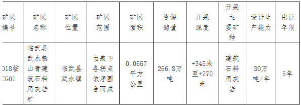 根據《中華人民共和國礦產資源法》、國土資源部關于印發《礦業權交易規則》(國土資規[2017]7號)的通知和《關于進一步完善采礦權登記管理有關問題的通知》(國土資發[2011]14號)等有關規定,經臨武縣人民政府批準同意,我局決定在湖南省國土資源網上交易系統(以下簡稱“網掛系統”)(http://www.hngtjy.com)以掛牌方式出讓以下礦區采礦權,并委托郴州市公共資源交易中心承辦具體事宜?,F將有關事項公告如下: