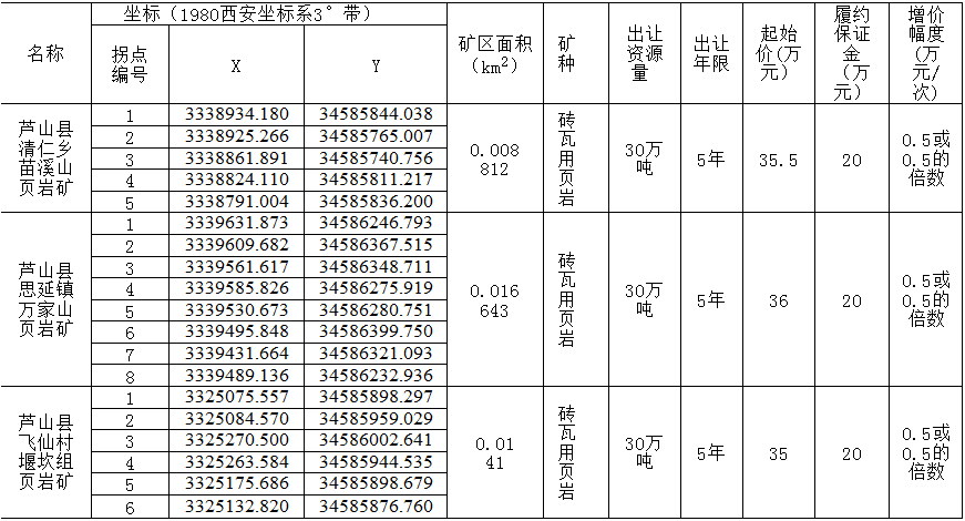 根據《中華人民共和國礦產資源法》、《探礦權采礦權招標拍賣掛牌管理辦法(試行)》、《關于建立健全礦業(yè)權有形市場的通知》、《礦業(yè)權交易規(guī)則(試行)》、《四川省采礦權招標拍賣掛牌出讓暫行辦法》等相關規(guī)定,蘆山縣人民政府決定掛牌出讓3宗采礦權。現將有關事項公告如下: