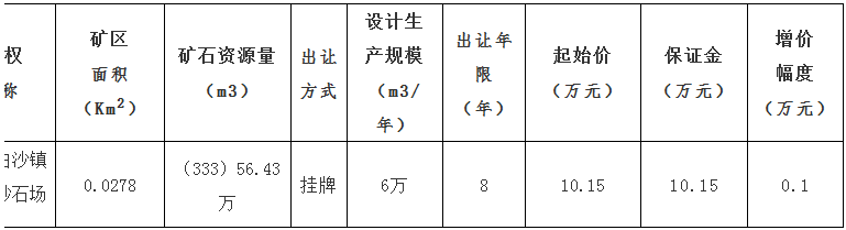 根據社會經濟發展和市場的需要,結合我縣砂石礦山整合工作實際,按照《中華人民共和國礦產資源法》、《礦產資源開采登記管理辦法》和國土資源部《關于印發〈探礦權采礦權招標拍賣掛牌管理辦法(試行)〉的通知》等文件精神,石阡縣國土資源局委托銅仁市公共資源交易中心石阡分中心對石阡縣白沙鎮柑子林砂石場采礦權以掛牌方式出讓,現將有關事項公告如下: