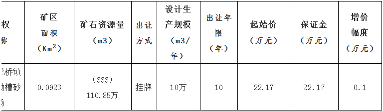 根據社會經濟發展和市場的需要,結合我縣砂石礦山整合工作實際,按照《中華人民共和國礦產資源法》、《礦產資源開采登記管理辦法》和國土資源部《關于印發〈探礦權采礦權招標拍賣掛牌管理辦法(試行)〉的通知》等文件精神,石阡縣國土資源局委托銅仁市公共資源交易中心石阡分中心對石阡縣花橋鎮涼亭村坳槽砂石場采礦權以掛牌方式出讓,現將有關事項公告如下: