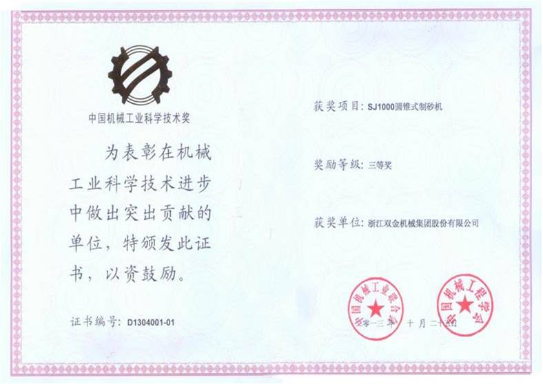 SJ系列制砂機為國內首創,通過了省級新產品認定,并被認定為浙江省裝備制造業國內首臺套,榮獲2013年度中國機械工業科學技術獎三等獎。