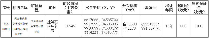 六、本次拍賣(掛牌)出讓的詳細資料、具體要求和其他未盡事宜,詳見《天全縣魚泉鄉獅子山灰巖礦采礦權拍賣(掛牌)出讓文件》。申請人可于2017年12月14日至2018年1月3日(法定節假日除外)上午8:30~12:00,下午14:30~17:30到雅安市土地礦產交易中心領取《天全縣魚泉鄉獅子山灰巖礦采礦權拍賣(掛牌)出讓文件》。