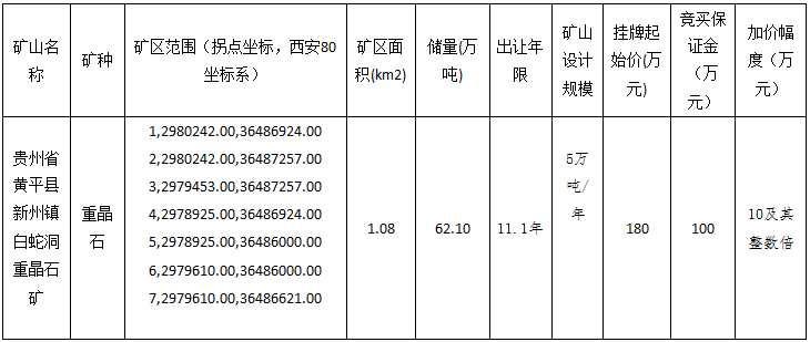 經州人民政府同意,由黔東南州國土資源局委托黔東南州公共資源交易中心公開掛牌出讓以下采礦權。現將有關事項公告如下:
