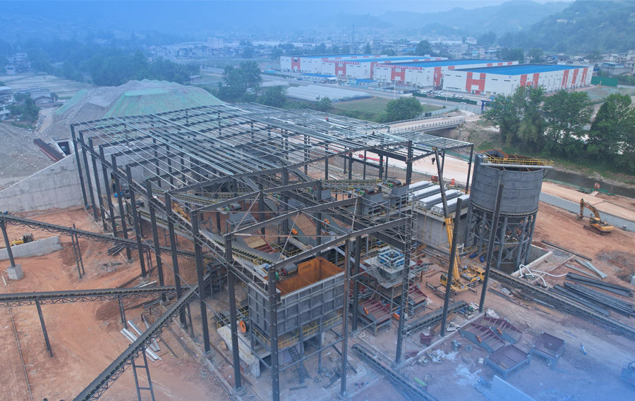 這里是四川雅安時產800噸復合型生產線施工現場。為什么叫復合型生產線呢?因為這個項目要同時破碎兩種原料,分別為夾砂鵝卵石和開山石,開山石的最大規格甚至高達1100mm。